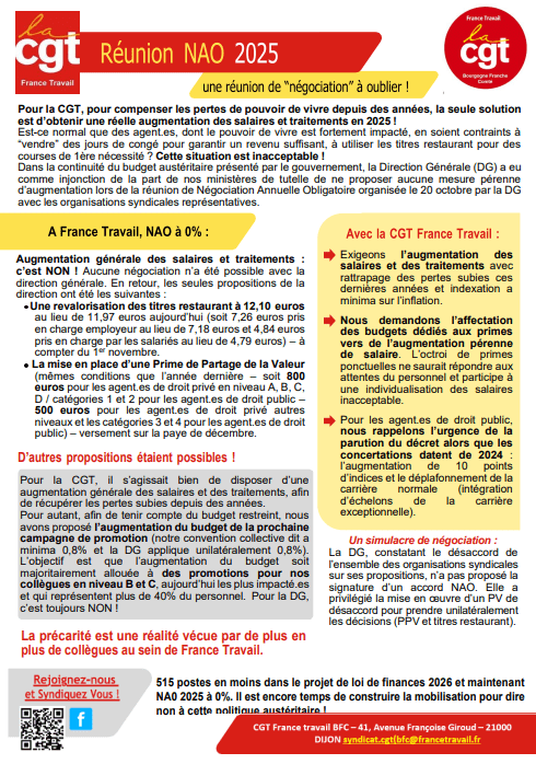 La CGT France Travail participe chaque année aux Négociations Annuelles 0bligatoires (N.A.O.) organisées au sein de l’établissement » France Travail « , en 2025, 515 postes en moins dans le projet du loi de finances 2024 et maintenant des N.A.O à zéro… 😖