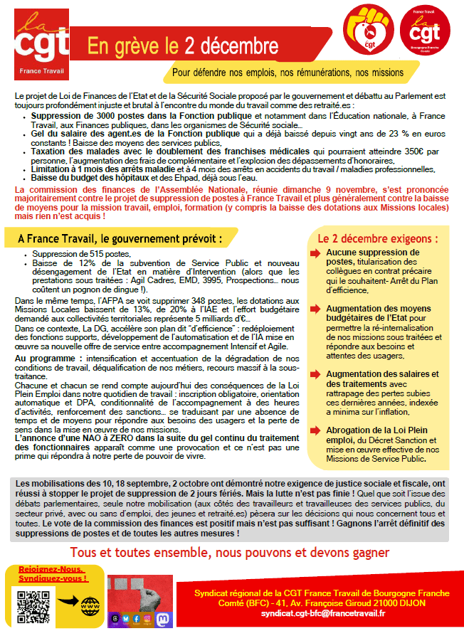 Grève du 02.12.2.2025 Défendons nos emplois nos salaires Communiqué CGT FT BFC
