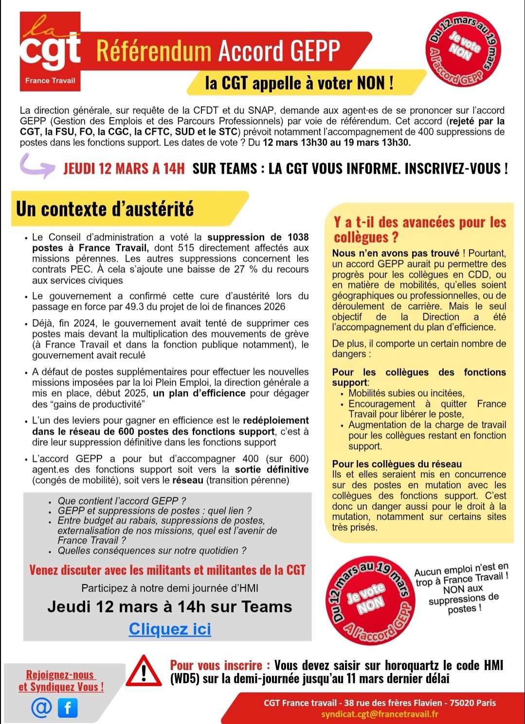 Alors même que 7 organisations syndicales représentant une grande majorité des personnels ont rejeté l’accord GEPP qui prévoit notamment 400 suppressions de postes dans les fonctions support mais pas que, la Direction Générale organise un référendum du 12 au 19 mars 2026.